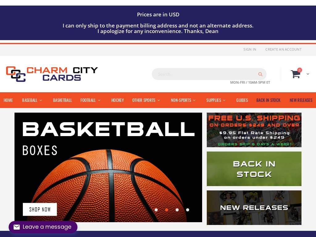 Charm City Cards is located in Baltimore MD and was established in 1989 starting as a retail store until 2005 then becoming an online storefront. Charm City Cards is located in Baltimore MD and was established in 1989.